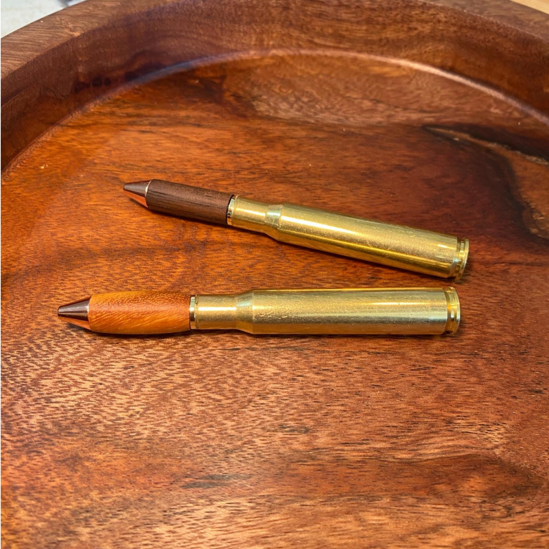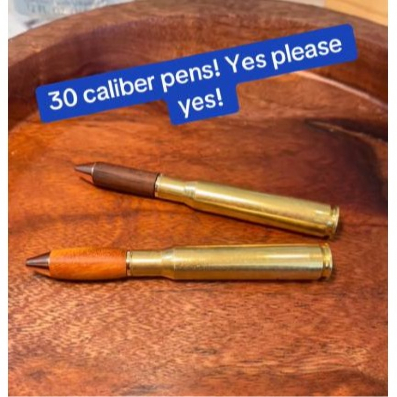 Check out this mini classy 30 caliber bullet cartridge pen- handmade. Easy to turn with a straight tube. Made with a genuine, fired and polished shell casing. Approx. 4" long. Please send a note/message with what color wood youd like. the light or the dark version.