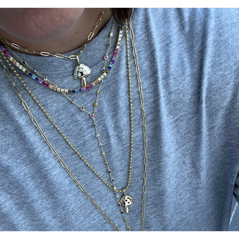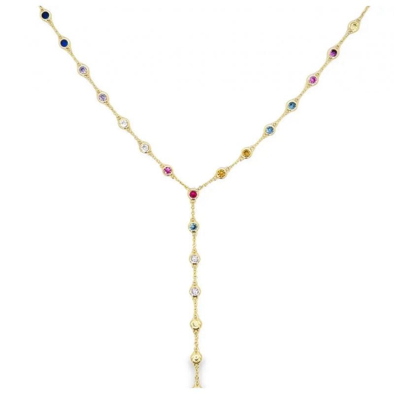 This elegant necklace features a delicate gold chain adorned with an array of colorful gemstones, creating a vibrant and eye-catching design. The Y-shaped silhouette adds a modern touch, making it a versatile accessory for both casual and formal occasions. This piece is perfect for adding a pop of color and sophistication to your wardrobe.