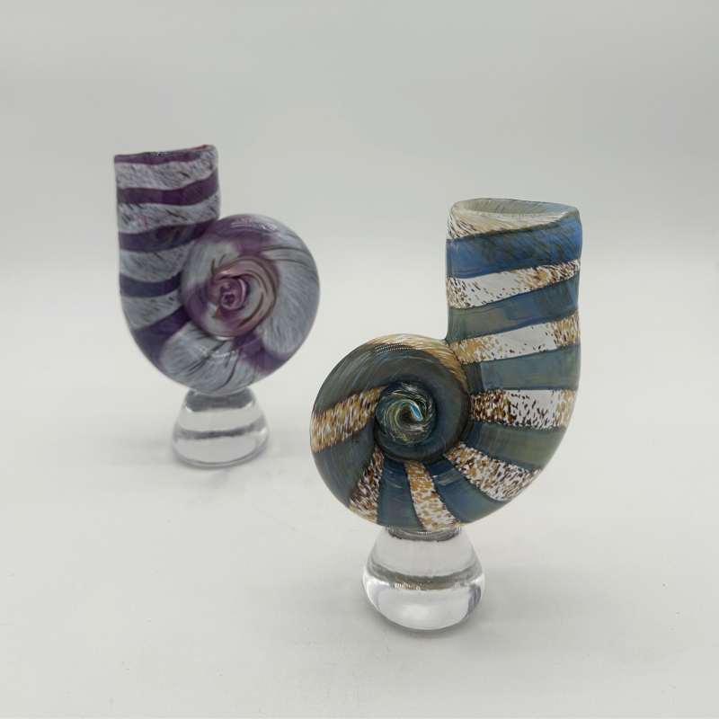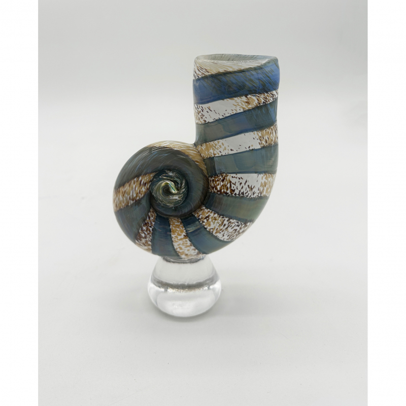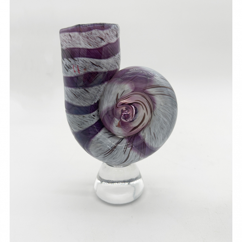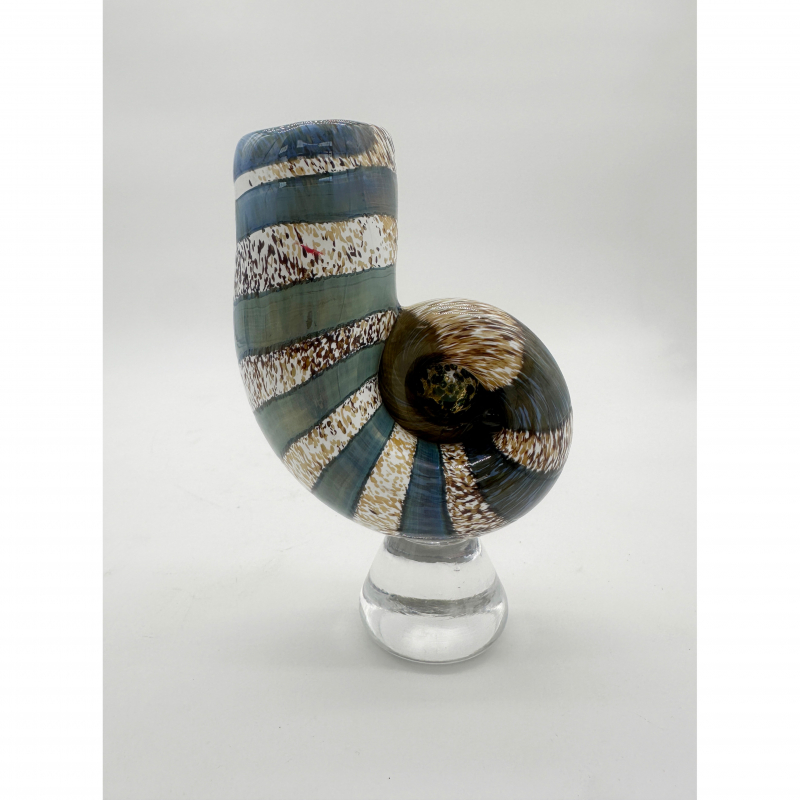 This blown glass ammonite sculpture is celebrating the beauty of ancient sea life. Its spiraled shell echoes the fossil's natural form. This sculpture combines craftsmanship with a sense of timeless natural history.