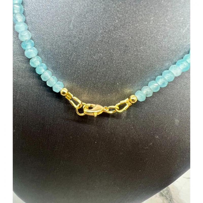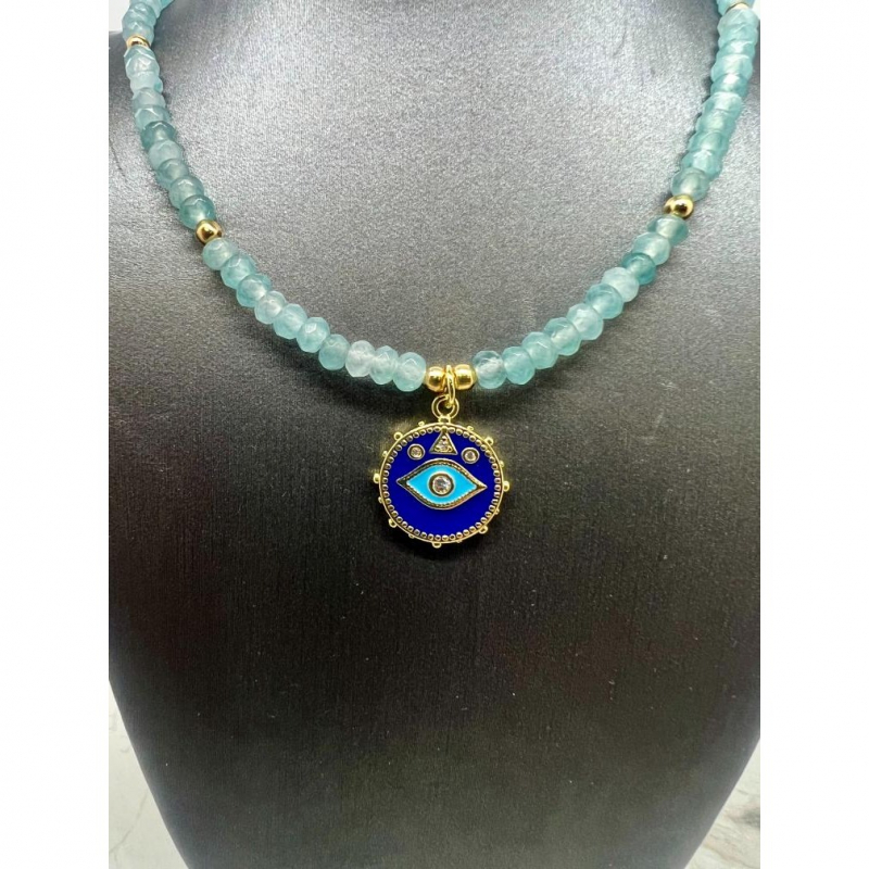 This aquamarine necklace is a true standout, featuring 4mm faceted aquamarine beads that catch the light with their soft, oceanic blue color. Paired with gold-plated stainless steel accents, it has just the right touch of warmth and elegance. The centerpiece is a charming enameled evil eye pendant, a symbol of protection and positive energy. It’s the kind of piece that’s both meaningful and stylish, perfect for adding a little sparkle to your everyday look or for making a subtle statement on a special occasion. Whether you’re treating yourself or gifting someone special, it’s a necklace that brings both beauty and good vibes.