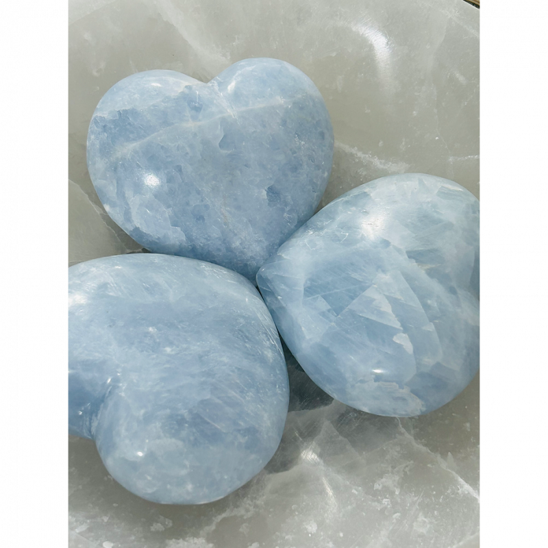 Connect with the gentle power of blue calcite with our beautifully polished hearts. This crystal is deeply connected to the Throat Chakra, promoting clear and compassionate communication. Blue calcite is believed to enhance psychic abilities, intuition, and spiritual awareness. It can also assist in releasing negative emotions, calming the mind, and fostering inner peace.