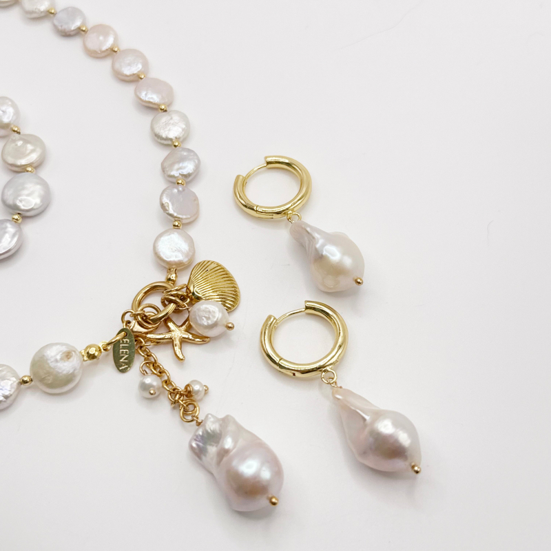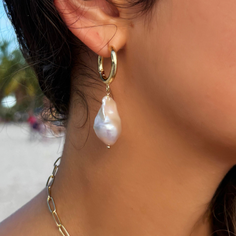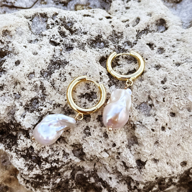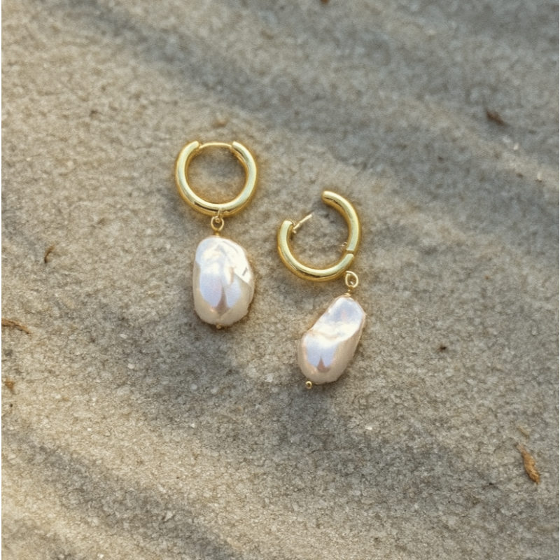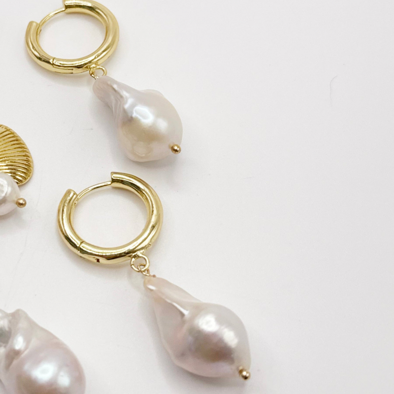 Light, luminous, and effortlessly elegant — the Brisa Earrings feature 12–13 mm baroque freshwater pearls suspended from sleek 18k gold-plated hoops.