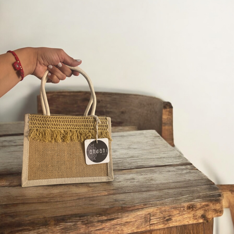 Canvas mini tote bag embellished with net and fringe trim in beige hues