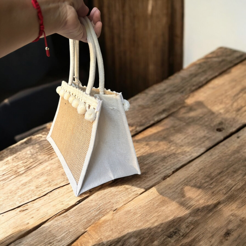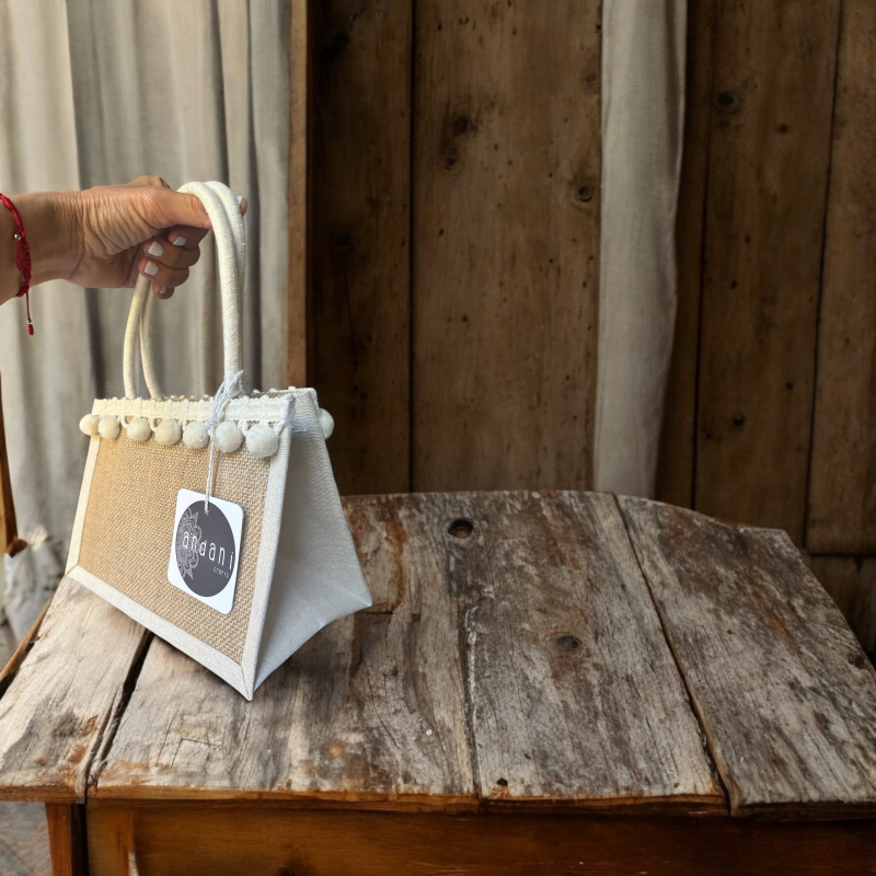Canvas Mini Tote Bag with Cream Pom Pom Accents