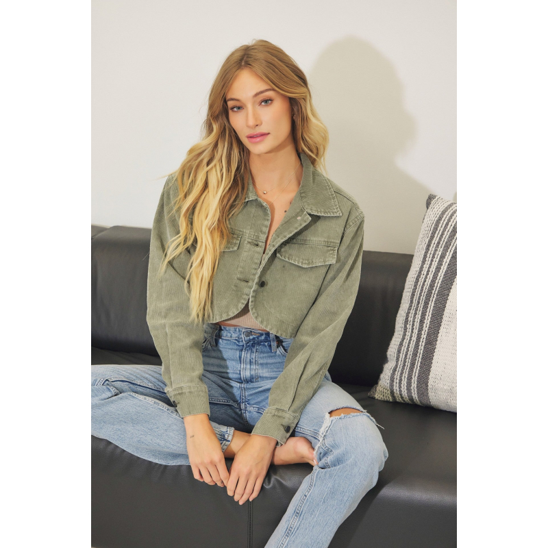 Get cozy in this cropped olive green corduroy jacket, crafted from soft, vintage-inspired corduroy, this jacket’s rich olive hue brings warmth and versatility to any outfit. The relaxed, slightly boxy silhouette with a flattering crop makes it an effortless layer over tees, sweaters, or dresses.
