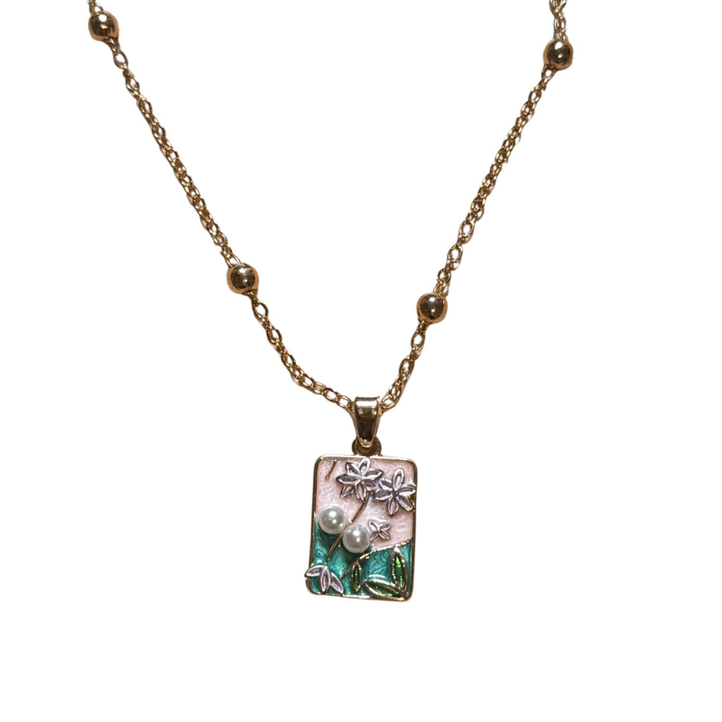 A delicate scene captured in enamel and freshwater pearl, the Enchanted Garden Necklace brings soft color and organic detail to life. Tiny blossoms and green leaves are hand-enamelled over a gold base, accented with lustrous freshwater pearls that add natural texture and light.