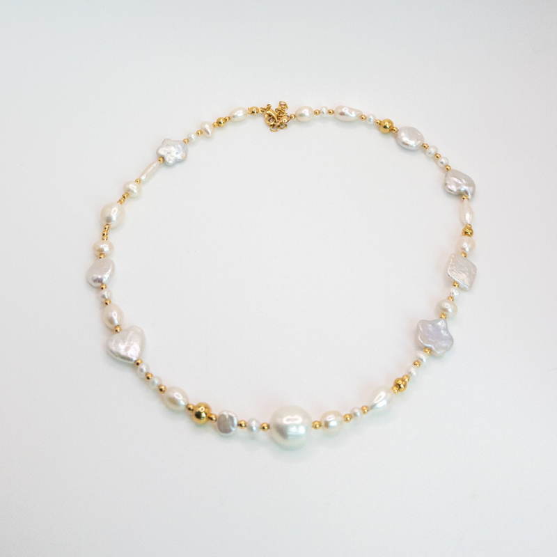 The pearl mix Necklace is made with a playful combination of freshwater pearls in different shapes — stars, hearts, rounds, and squares. Each one is slightly different, making every necklace truly one of a kind.