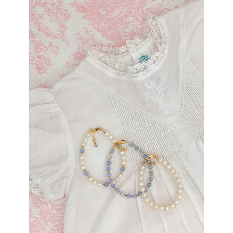 A darling set of bracelets, as graceful as it is timeless. The Gemstone Collection in Periwinkle features our precious Periwinkle Agate, a gemstone known for its soft, dreamy hues and natural beauty. Paired with lustrous freshwater pearls and radiant gold-filled beads, this set is the perfect blend of elegance and charm. Whether worn together or separately, these bracelets add a delicate touch to any little wrist.