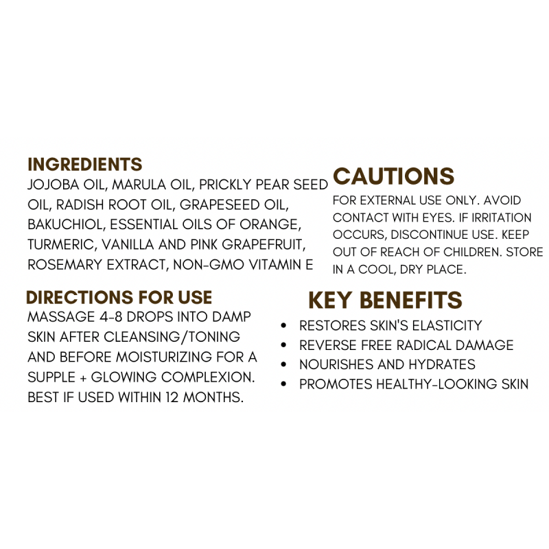 HOW TO USE: Massage 4-8 drops into damp skin after cleansing/toning and before moisturizing for a supple + glowing complexion. Best if used within 12 months.