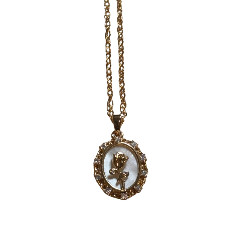 Elegant and enduring, the Golden Rose Cameo Necklace features a sculpted gold rose set against a luminous mother of pearl background, framed by a halo of sparkling cubic zirconia. Each element reflects light beautifully, creating a look that feels both classic and modern.