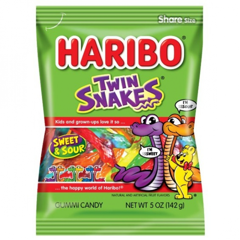 Sssweet and Sssour Twin Snakes are closely coiled together in a pack of delicious gummies with flavors like Cherry & Orange, Apple & Lemon, and Blueberry & Blackcurrant. Eat them together or pull them apart for double the fun!
