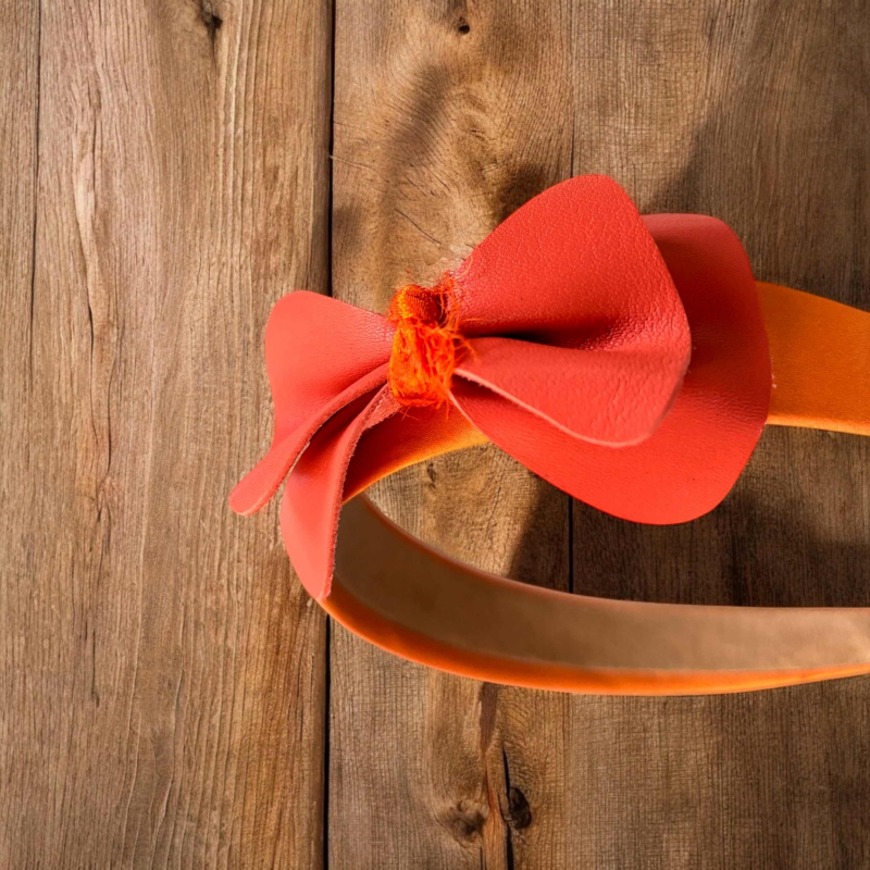 Handcrafted fabric headband with orange leather bow applique.