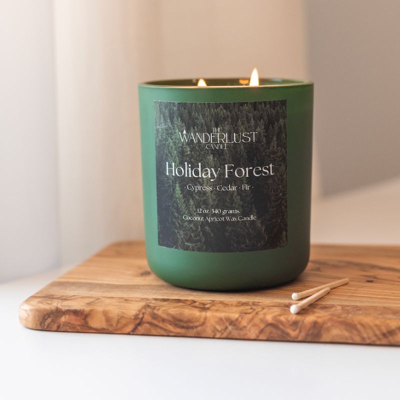 Holiday Forest, a captivating blend that transports you to the heart of a serene winter woodland. Infused with the crisp, earthy aromas of cypress, cedar, and fir, this candle captures the essence of evergreen trees.