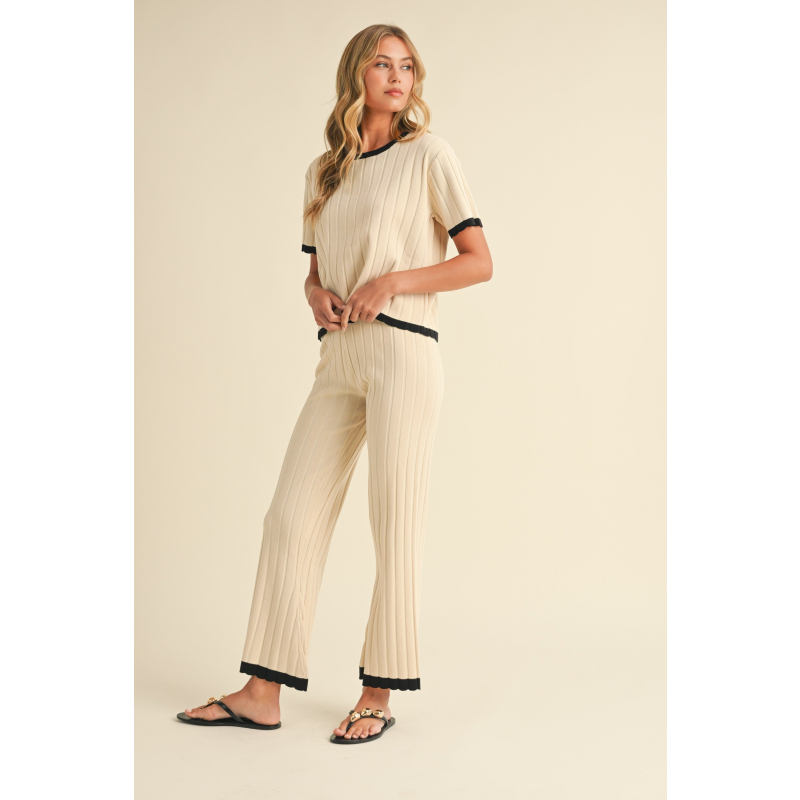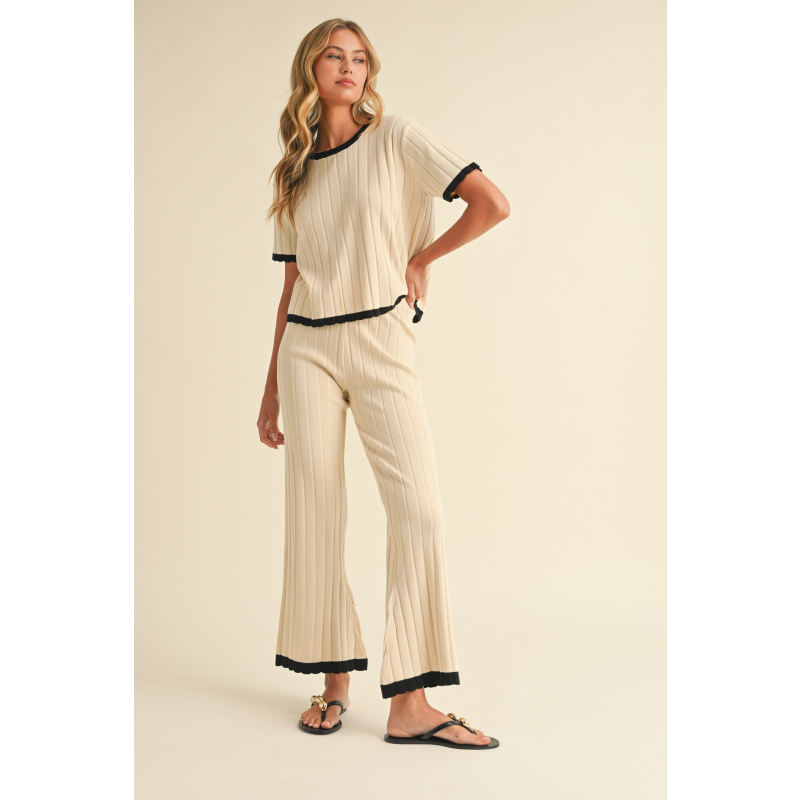 Designed for comfort and sophistication, this set features a cozy ribbed sweater with bold contrast borders that add a chic, modern edge. Whether you're relaxing at home or heading out, this sweater set is your go-to for comfort and timeless fashion.