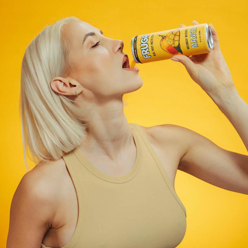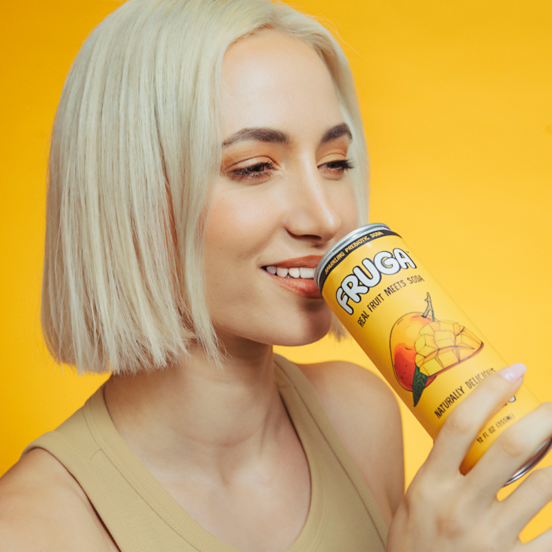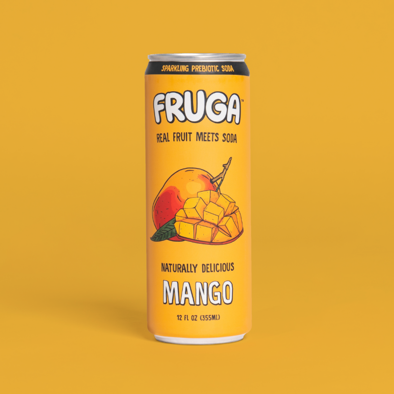 Experience the Refreshing Taste of Mango: FRUGA Sparkling Fruit Super Soda combines the tropical flavors of mango with a health-boosting prebiotic blend, offering a delightful fruit soda.
