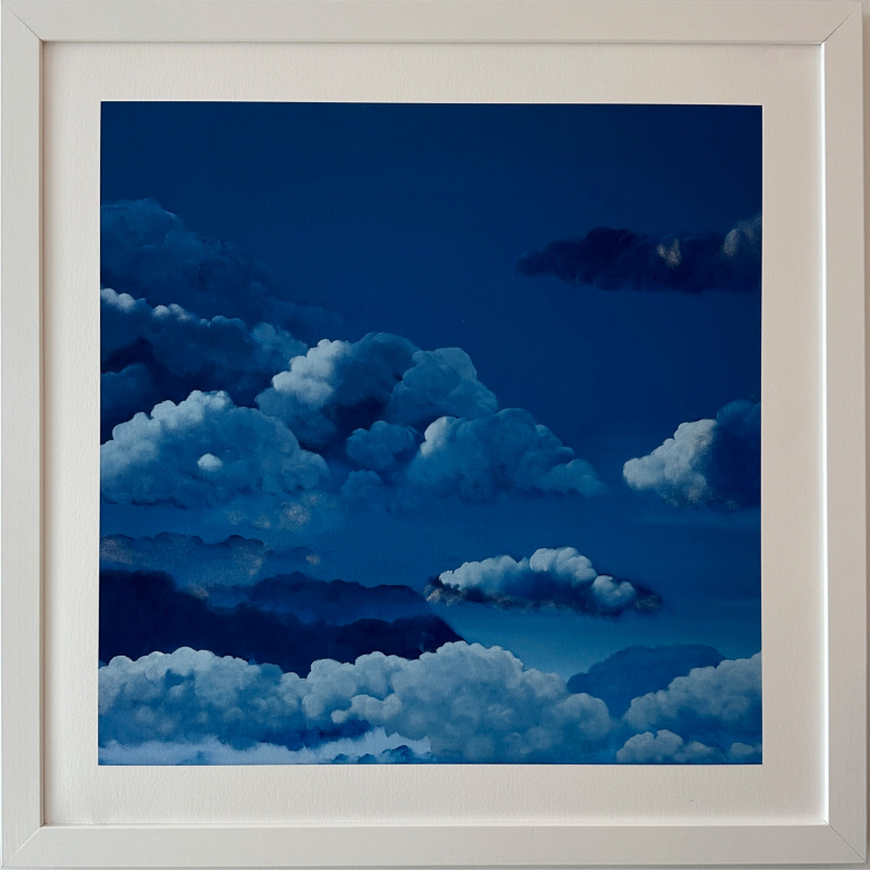 24' x 24' print of "Mr. Blue Sky" printed on Hahnemuhle German Etching paper. This paper produces a textured matte reproduction of the original painting that is crisp and colorful. Printed with a 2 inch white border all around for easy framing. Frame not included.
