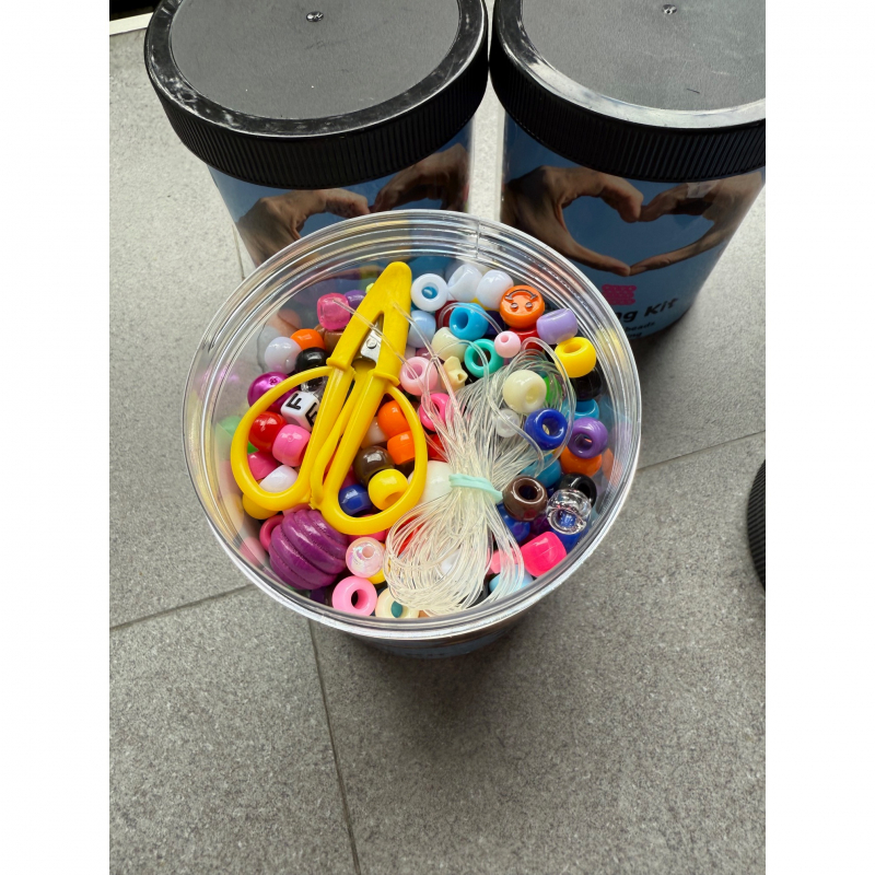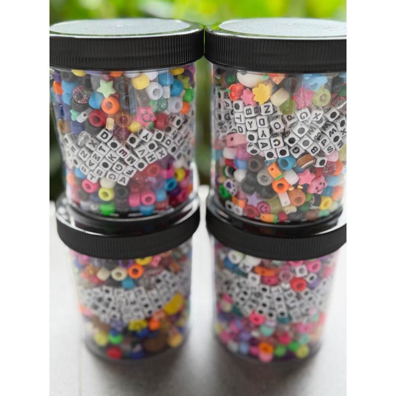 Unisex mystery assortment of mixed pony and other fun beads with square block letter beads. Includes mini scissors and high-quality clear elastic cord enough to make 10+ bracelets and/or necklaces. Bead containers are reuseable and refillable. Contents are carefully packed with tissue paper so contents will not shift significantly during transit. These make a great birthday, holiday, or special occasion gift, travel activity, or rainy day craft.