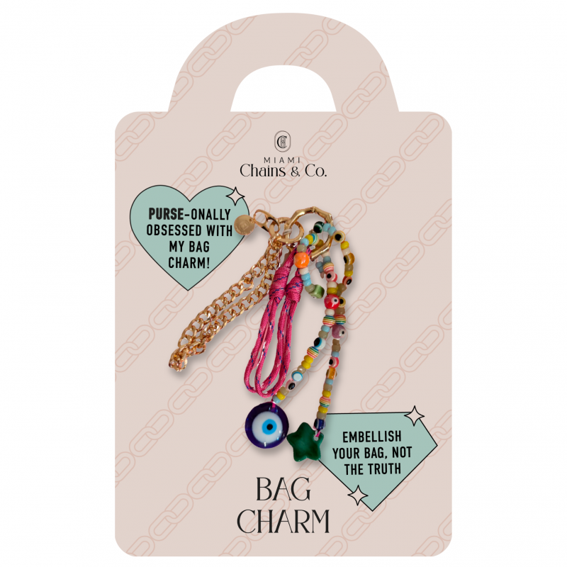 Bag Charm featuring 14K Gold Plated Cuban Link Chain, Neon Nylon Cords, Multicolor/Transparent Beads with Jumbo Evil Eye Pendant.
