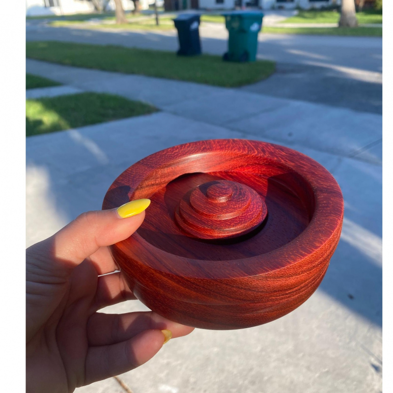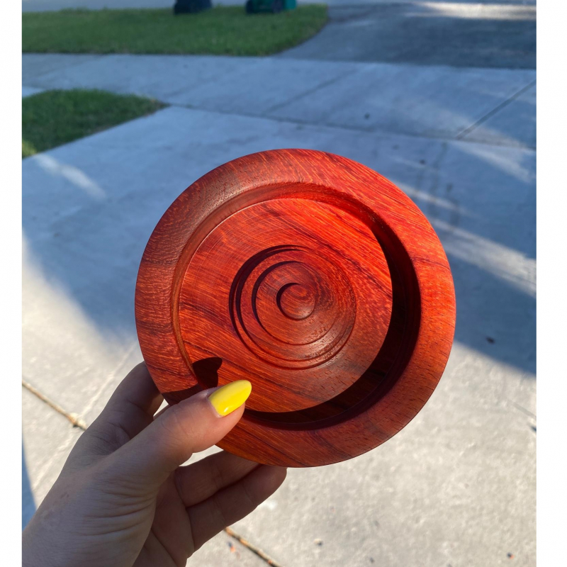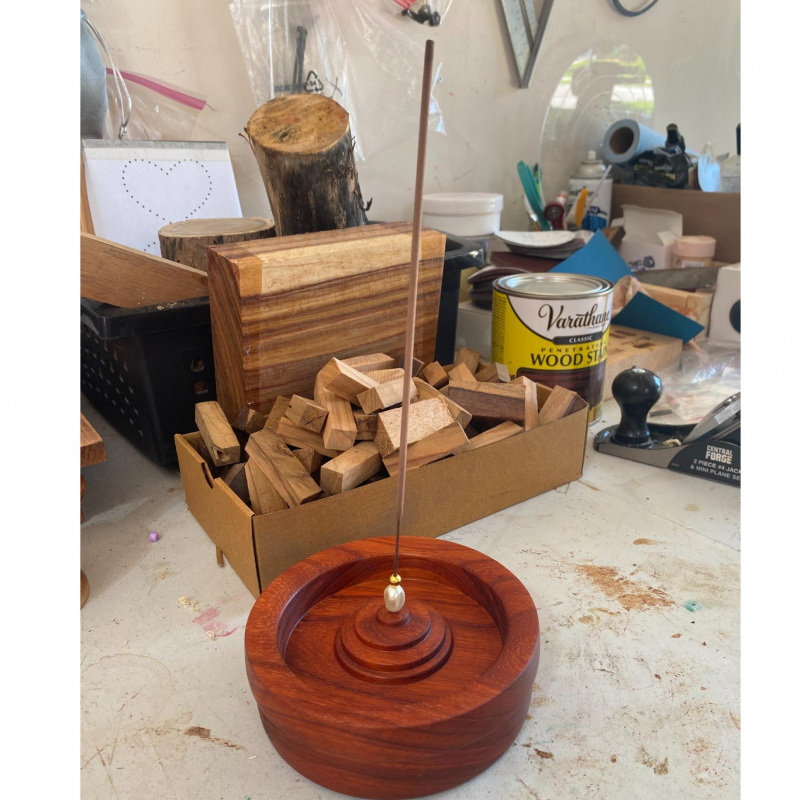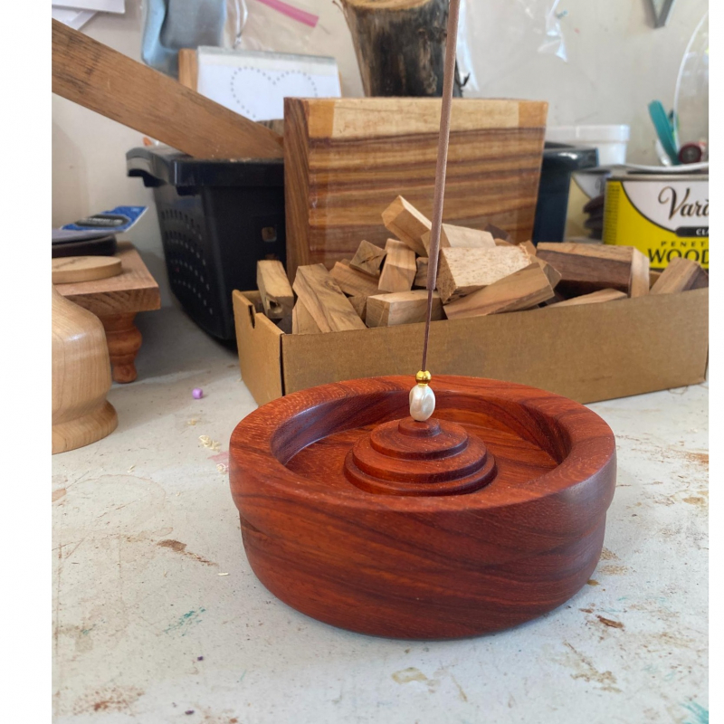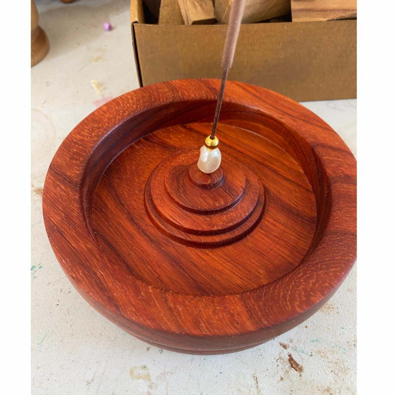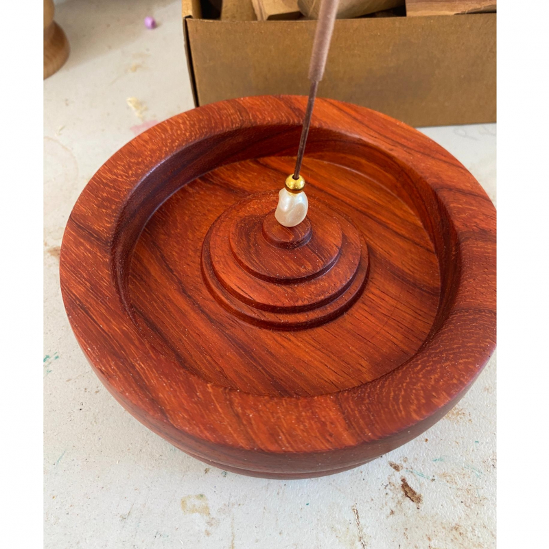 Paduk Incense Holder. A gorgeous red toned wood! This solid wood incense holder is a beautifully handmade piece that blends traditional craftsmanship with modern design. The natural grain of the wood adds warmth and elegance, making it an ideal decorative element for any space! 5" across, 2" tall.