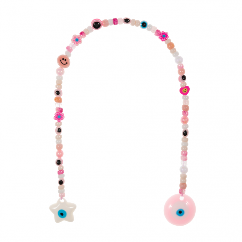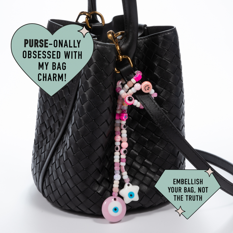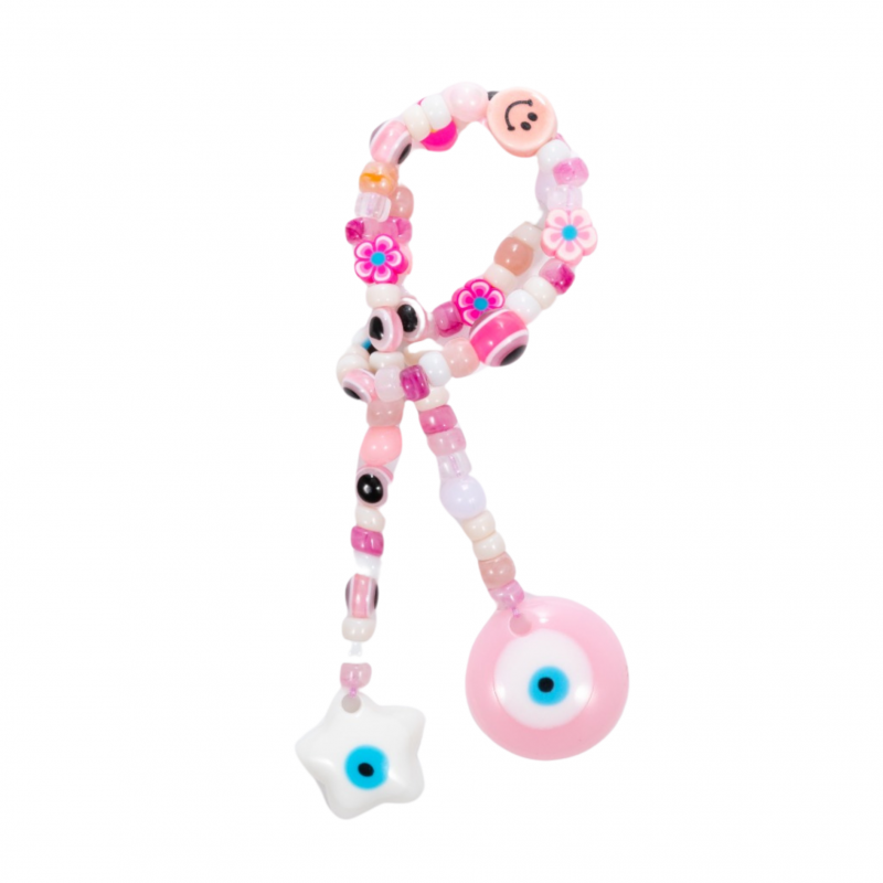 Vibrant Bag Charm featuring various pink shades of beads including smile, heart and flower beads with pearls and jumbo pendants on both ends - star and evil eye. Wrap in a loop around the handle of any handbag.