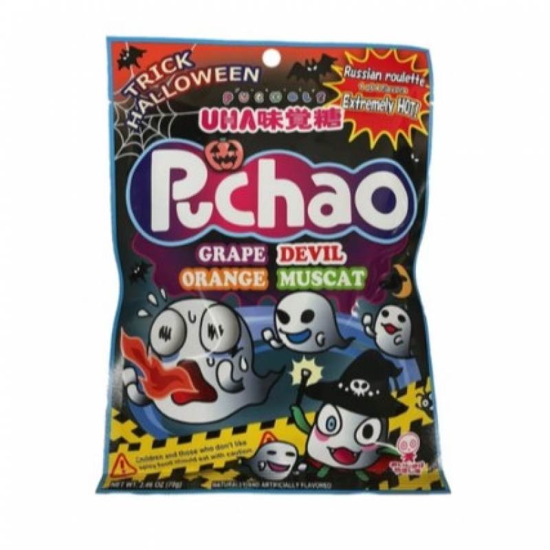Individually wrapped Puccho / Puchao chews in 4 special edition halloween trick mix flavors in a 2.46 oz bag. Grape, Orange and Muscat are the originals, while the Devil flavor is spicychili pepper.