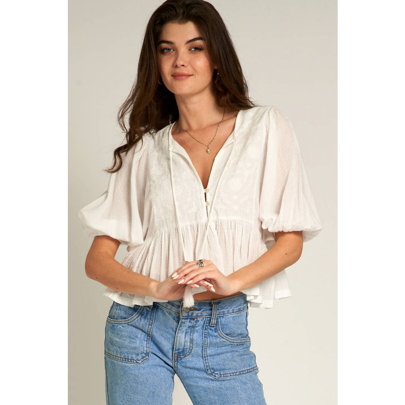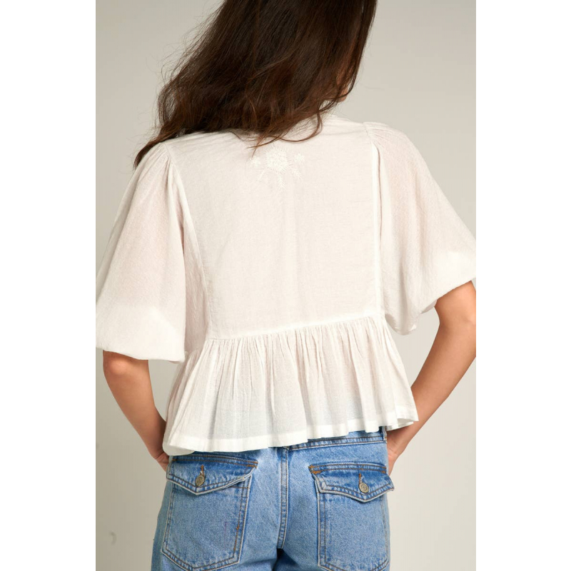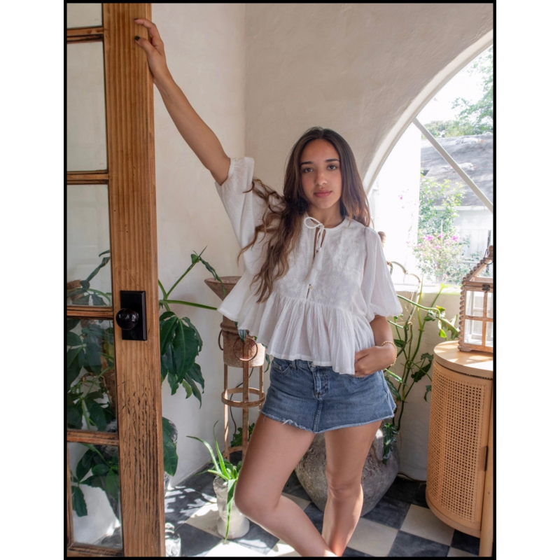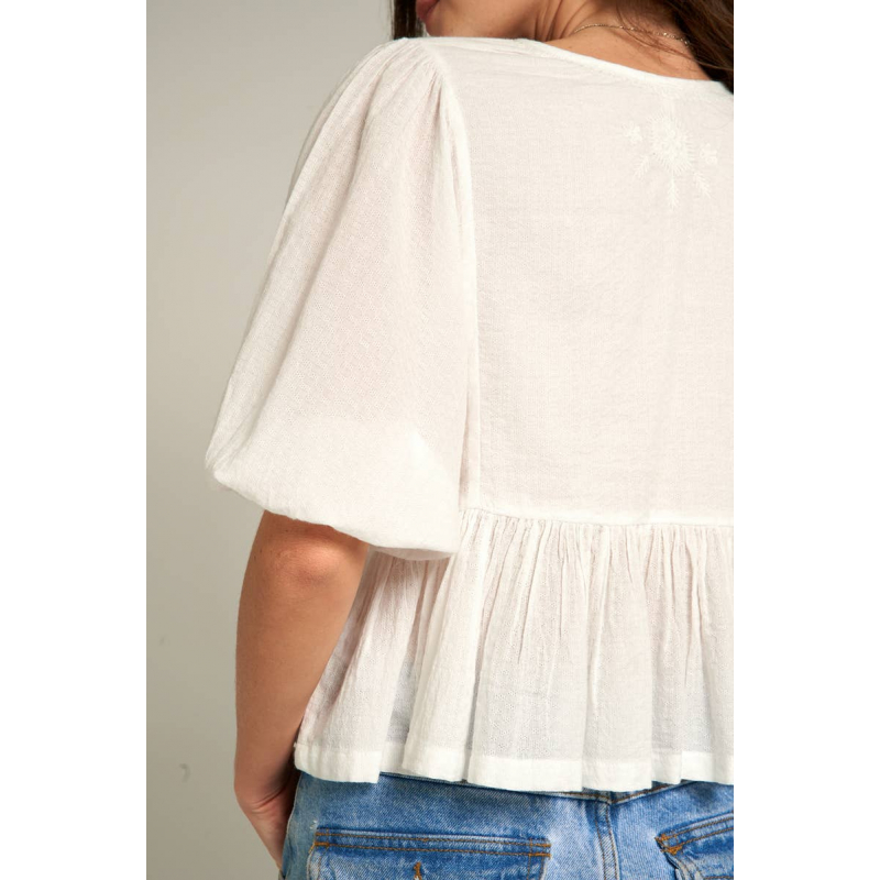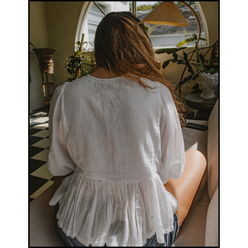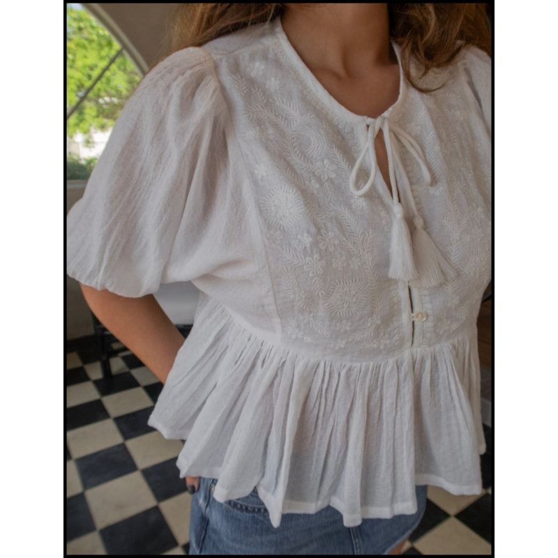 The Palmas Embroidered Top is a celebration of exquisite detail and classic design. This 100% cotton peplum top is a testament to timeless style with a modern twist. Embroidery detail adds a delicate, artisanal touch, making each piece uniquely beautiful. The puff sleeves bring a hint of romance and volume, perfect for elevating any look.