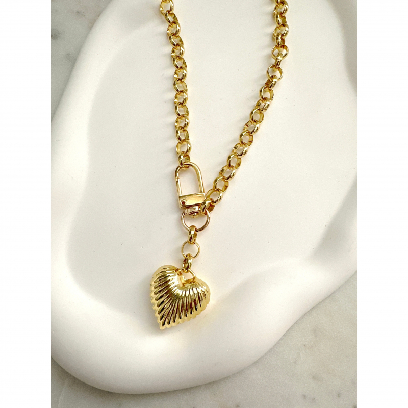 The Puffy Heart Lariat adds a touch of elegance to any outfit. At 21 inches in length, it can be worn alone or layered with other necklaces. The gold plated design features a charming puffy heart with a unique sunburn pattern, making it a must-have for any fashion-forward individual.