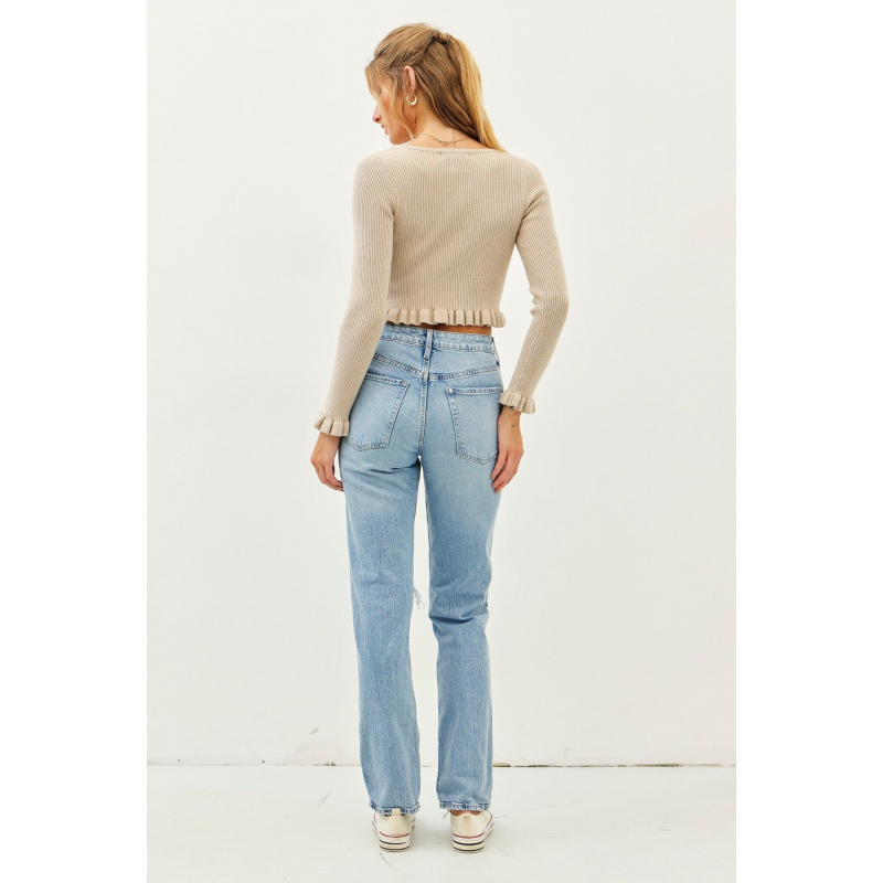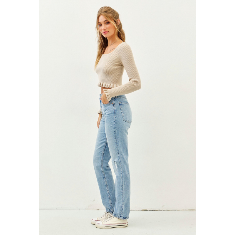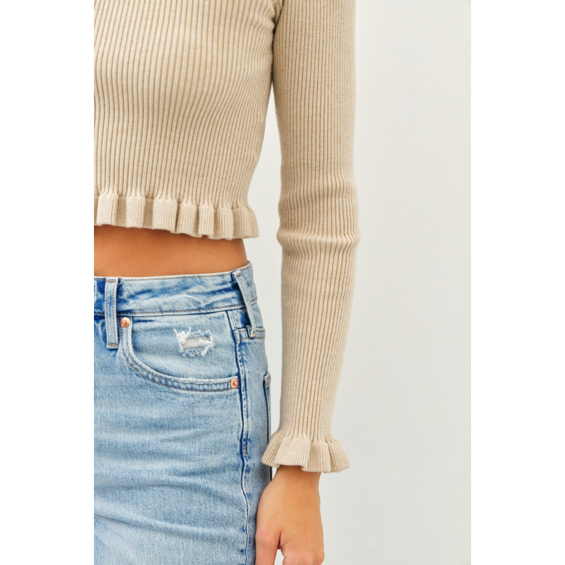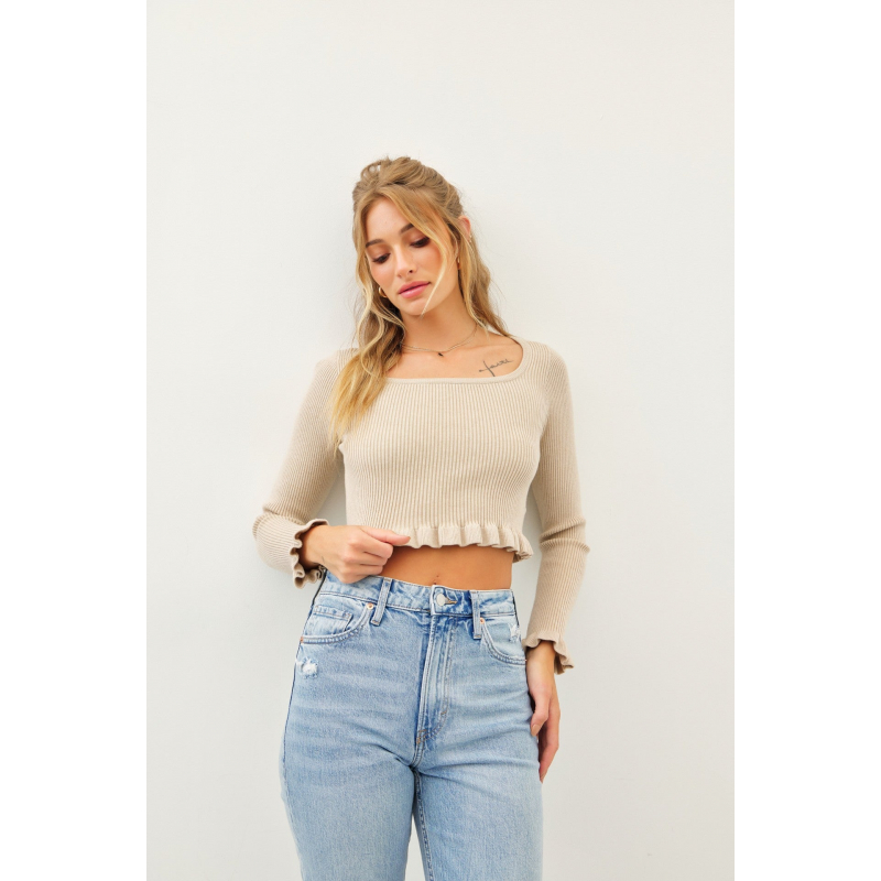 Elevate your style with our Ribbed Sweater Crop Top, featuring delicate mini ruffles, a chic square neckline, and elegant long sleeves. Perfect for any occasion, this top adds a touch of feminine flair to your wardrobe.