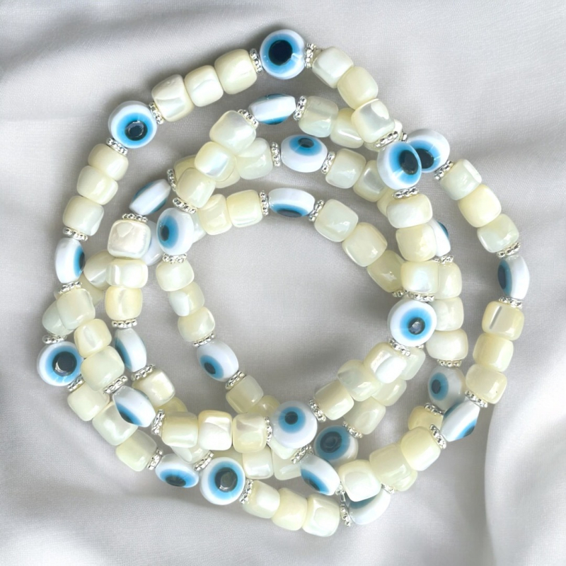 Keep yourself protected from all the bad vibes with vintage mother of pearl beads, metal alloy silver-colored disks, and acrylic blue and white and evil eye beads. This is an easy everyday piece of jewelry. High quality and goes with everything. On clear elastic string. Looks great by itself or in a stack.