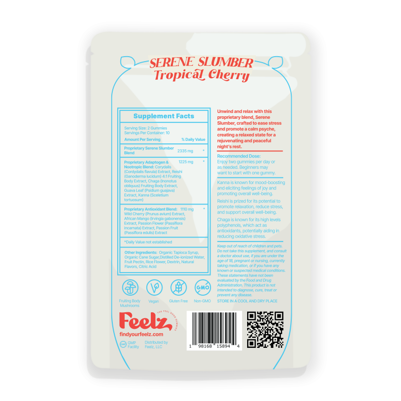 Unwind and relax with our proprietary blend, Serene Slumber, crafted to ease stress and promote a calm psyche, creating a relaxed state for a rejuvenating and peaceful night's rest.