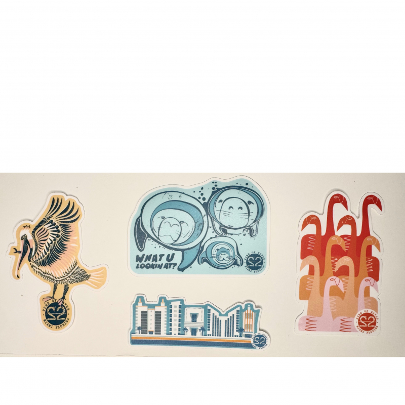 Quirky, fun and full of personality. Stickers feature our best designs: What You Lookin At, Fading Flamingos, No Beak Deal and Miami Deco Beach.