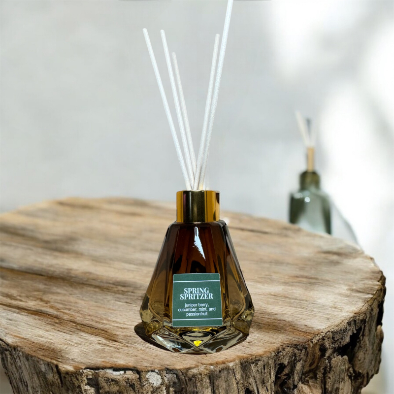 Reminiscent of a fresh spring breeze, the Spring Spritzer is a bold combination of herbal and fruity fragrances that will enlighten your senses. As a part of the gin line, the Spritzer has a base of juniper berry to imitate the main component in the liquor. It is elegantly blended with the fresh essence of cucumber, mint and a hint of passionfruit. Our Reed Diffusers are the perfect way to add some extra fragrance to areas like the kitchen and bathroom, while also adding some elegant decor to your space.