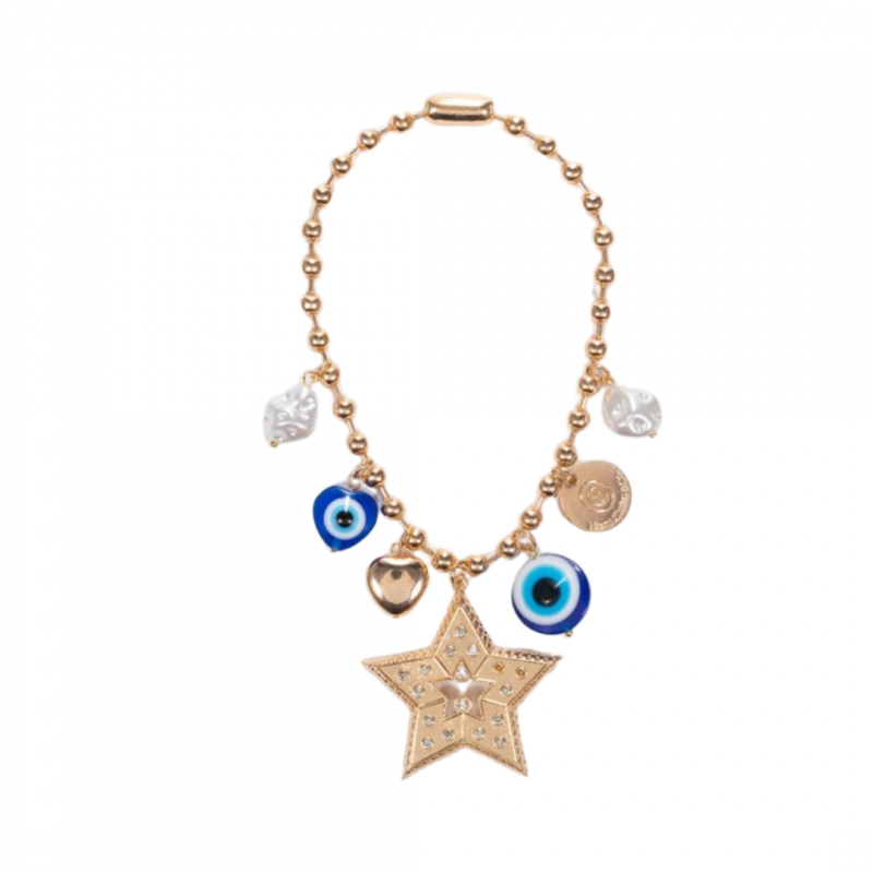 Bag Charm featuring 14K Gold-Plated Ball Beaded Chain with Heart, Evil Eye and Pearl Charms. Signature Gold Plated Star Pendant.