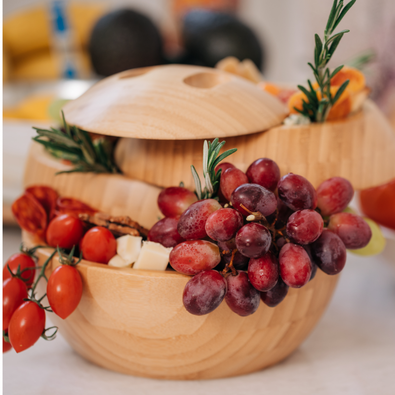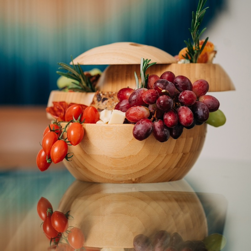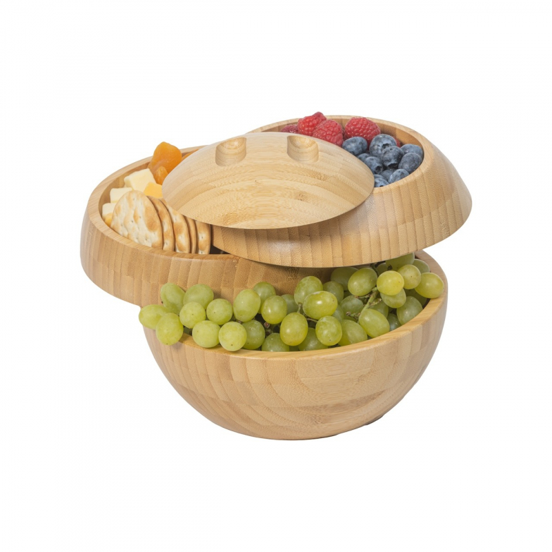 When a simple board or bowl just won't do, try a sphere! Our All-Natural Serving Containers and Tiered Trays are unique for a variety of occasions. MINIMALIST DESIGN- Our Patented Tiered Serving Containers are Perfect For Home or Kitchen Decor. Tappas was tailor-made for those who love to host dinner parties and intimate gatherings, have a flair for modern accent pieces. THREE COMPARTMENTS- For Food or Small Item Storage. Our multi-level design is one-of-a-kind. Our wood bowl is 8in. and holds up to a liter. FUNCTIONAL- Twists open and has a flat bottom for stability. The knob below locks the plates in place for transport. Loosen the knob below to beautifully display your delicious bites. SUSTAINABLE MATERIALS- Made of Natural Bamboo, Eco-friendly, Non-Toxic, and Food safe. Our container is made with the highest quality wood and craftsmanship. With every purchase, a portion of sales is donated to climate action initiatives. EASY TO CLEAN- Detachable layers make our plates easy to clean. Tappas is not dish washer friendly. We recommend hand washing with cold water and air dry.