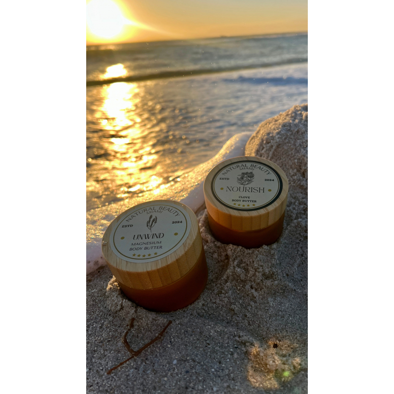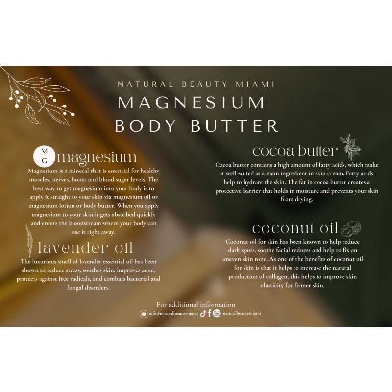 Magnesium Body Butter: Magnesium is a mineral that is essential for healthy muscles, nerves, bones and blood sugar levels. The best way to get magnesium into your body is to apply it straight to your skin via magnesium oil or magnesium lotion or body butter. When you apply magnesium to your skin, it gets absorbed quickly and enters the bloodstream where your body can use it right away!