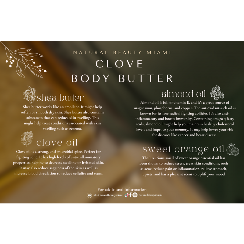 Clove Body Butter: Let the sweet, toasty nodes of orange, cinnamon and clove captivate your senses! The natural ingredients used in this recipe can skin soothe irritations such as eczema, rough knees or elbows, and body acne, and even minimize fine lines and wrinkles. Also great for expecting moms to use as a belly butter! This body butter is naturally rich in essential fatty acids. Clove oil is known for its ability to reduce skin sagging and the appearance of fine lines, cellulite and stretch marks all while deeply hydrating your skin. Plus, it's able to boost blood circulation in your body, further improving its appearance.