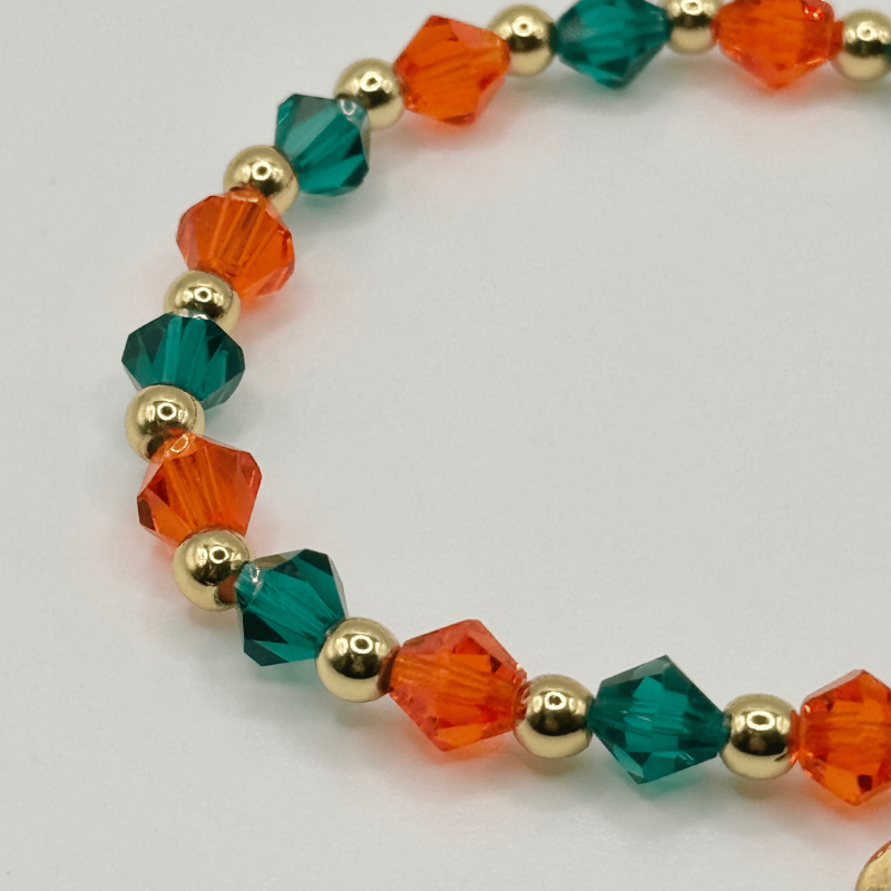 Bold color with school spirit. The University Bracelet pairs vibrant orange and green glass beads in a clean, stackable design perfect for showing your pride—whether it's game day or just a pop of personality. Finished with gold-plated accents, it’s lightweight, easy to wear, and made to mix with your everyday favorites.