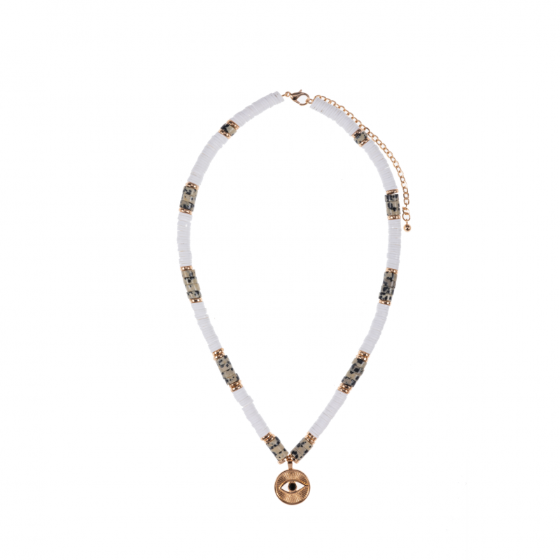 White & Gold Heishi Beaded Necklace w/ Leopard Marble Beads & 18k Gold Plated Disc Beads & Black Onyx Evil Eye Pendant