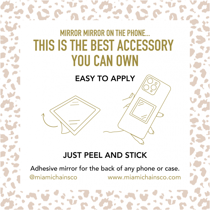 Suebelle x Miami Chains & Co Phone Mirrors are adhesive mirrors that adhere to the back of all phones and cases. No more searching through your handbag for a mirror. A must-have accessory!