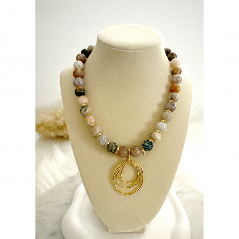 Elevate any outfit with Zarelle, a stunning Earth tone agate necklace featuring a gold plated free form three ring charm. This statement piece boasts 10mm beads and a 16 inch length, making it a versatile addition to any jewelry collection. Embrace elegance and style with Zarelle.